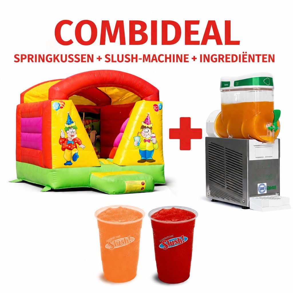 Springkussen Feestje (art. 1450) + Slush-puppy enkel (art. 0990) + een compleet slush puppy pakket voor 50 bekers slush (art.0989 of 0991). Keuze uit de smaken aardbei en orange.
